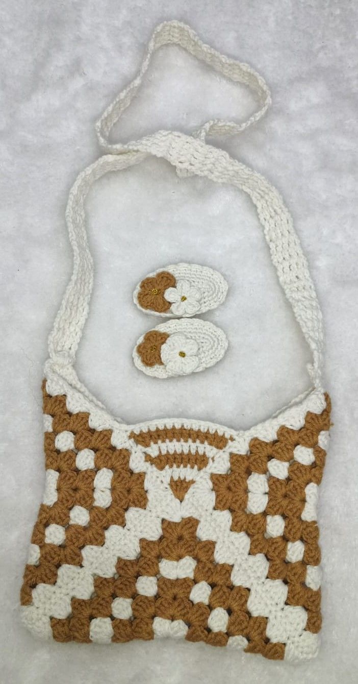 Kahverengi Krem El Örgüsü Çanta-Toka Set
